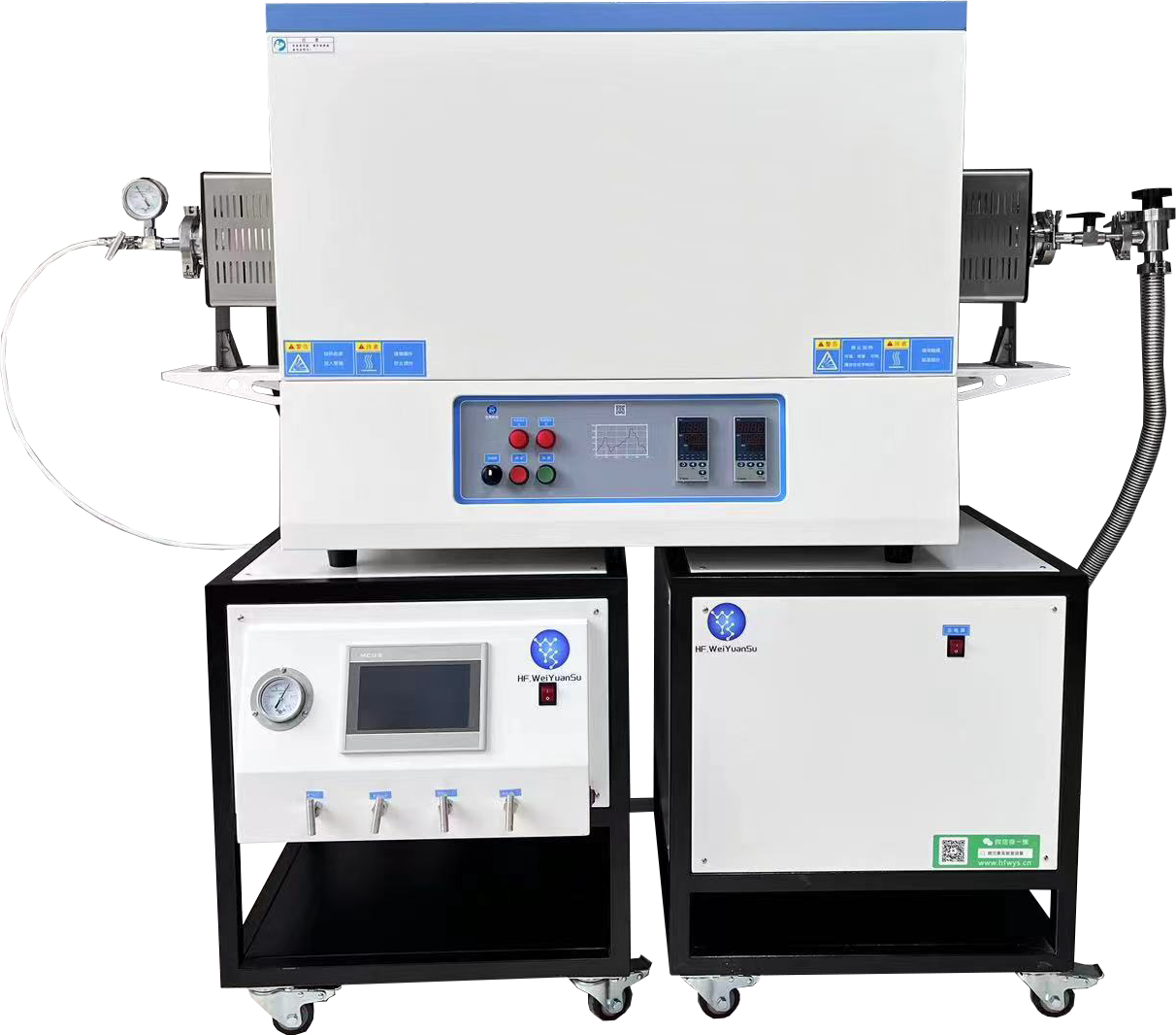 ?爐體結構:配有一對不銹鋼密封法蘭,采用硅膠密封圈密封;石英管口徑可選:φ25;φ50 ;φ60;φ80; φ100,石英管的設備設有法蘭支架;真空度:10-2torr(采用機械泵)安裝有一機械壓力表,測量范圍為-0.1~0.15MP 。